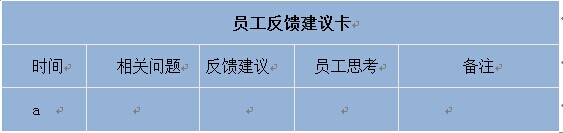 既然我們要求每一個員工都要隨時發(fā)現(xiàn)問題,隨時反饋問題,“好記性不如爛筆頭”,那么設(shè)計一張表格進(jìn)行記錄是最好的選擇。下表就是一張員工反饋問題建議卡。